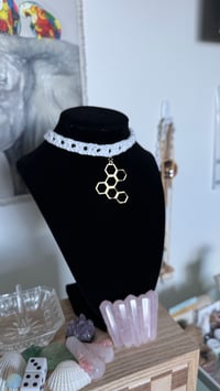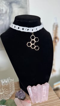 Sweet as honey & sharp as a hexagon, this handmade crochet choker brings a modern twist to nature-inspired jewelry. Crocheted in soft 100% Italian white cotton yarn and accented with a gold-tone honeycomb pendant, it’s an eye-catching piece that nods to both geometry and the sacred structure of the hive.